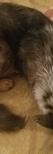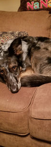 We stole Riley away from a Walmart greeting position where she was grossly under appreciated. She now works full time for us licking wounds (physical and emotional), laying on laps giving her best sad eyes if you are ill or had a rough day, greeting visitors, and sounding the alarm for package deliveries, dog crossings and leaves falling. She investigates angry voices and mediates resolution by jumping in the middle and licking both sides.